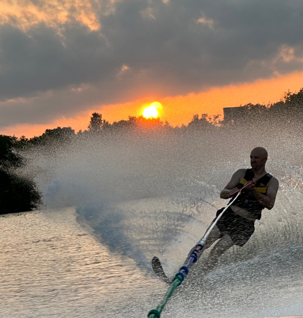 One of the hardest shots I’ve ever taken — Jamie skiing with sunset over the spray – July 2023